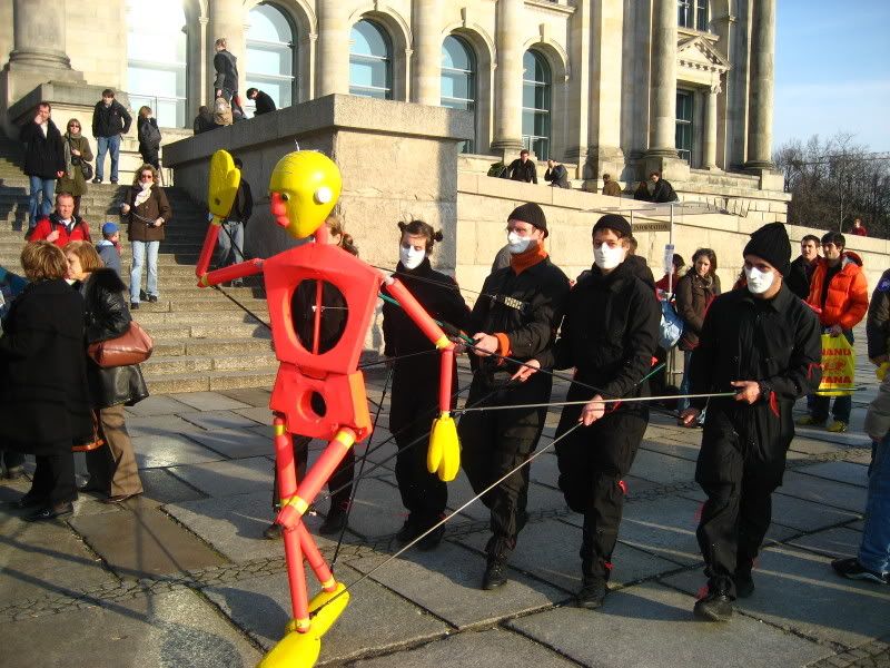 And here's another travel memory for the day. This picture was taken outside the Reichstag (German parliament) in Berlin in March this year. I don't know where the performers are from, but I found it pretty cool. I know the kids in the crowd loved the whole thing too. No, they weren't making some political statement about how the legislative is merely a puppet of the executive. That would be far more appropriate in, oh, I'm sure you can figure out where. I should probably take more recent photos to upload though.